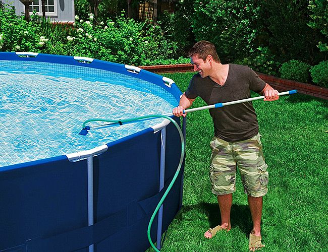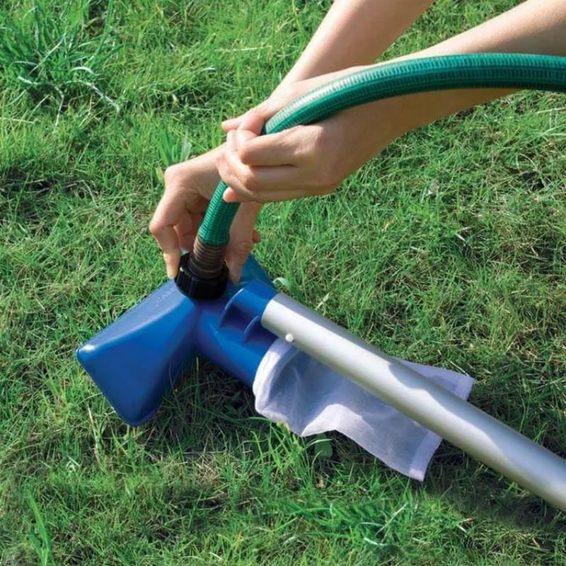 Универсальный набор позволяет бороться с загрязнением бассейна, не прилагая титанических усилий. В комплекте используется сачок для сбора мусора на поверхности воды и специальная насадка-пылесос, которая служит для очистки поверхности под водой. Обе насадки крепятся на легкую телескопическую алюминиевую ручку длиной 239 см, обеспечивающую доступ в любую точку бассейна диаметром до 457см. Принцип работы насадки-пылесоса: насадка присоединяется к садовому шлангу, опускается на дно бассейна, где напором воды поднимается осевшая грязь. Пылесос фильтрует воду, осаживая загрязнения в специальном мешке для сбора мусора.