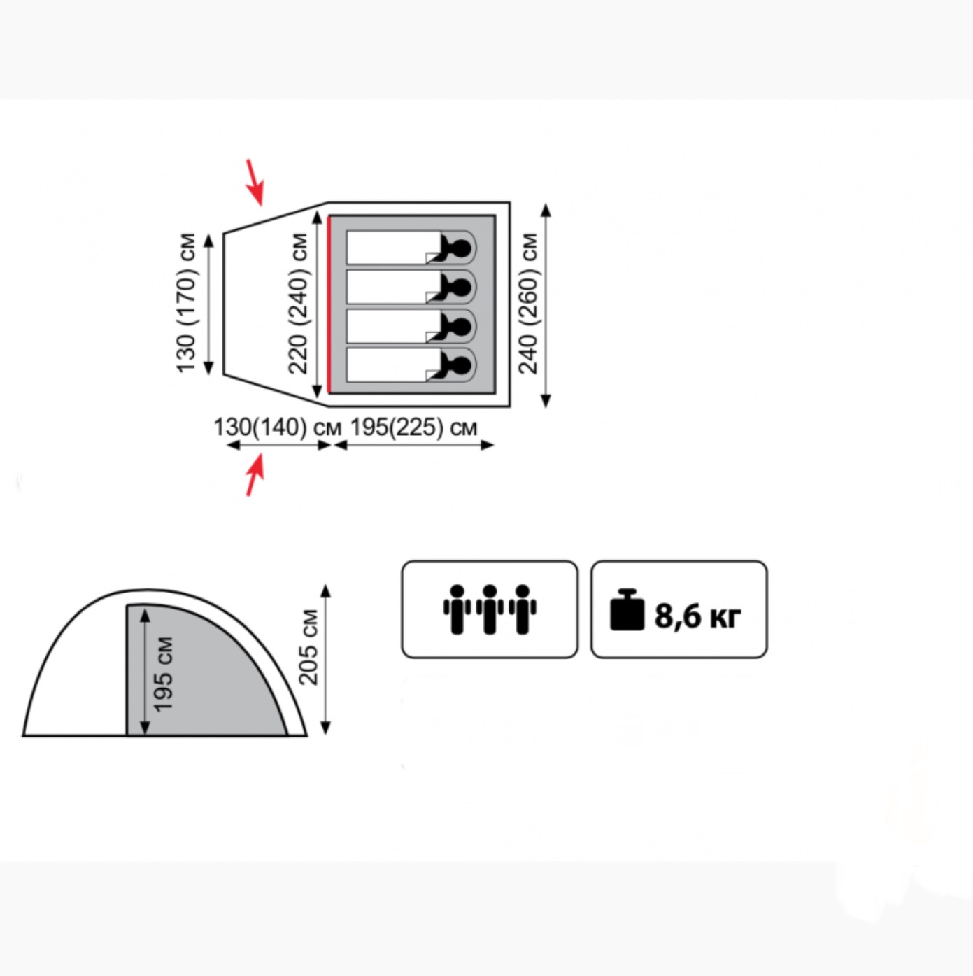 – Двухслойная кемпинговая палатка с двумя входами, большим тамбуром