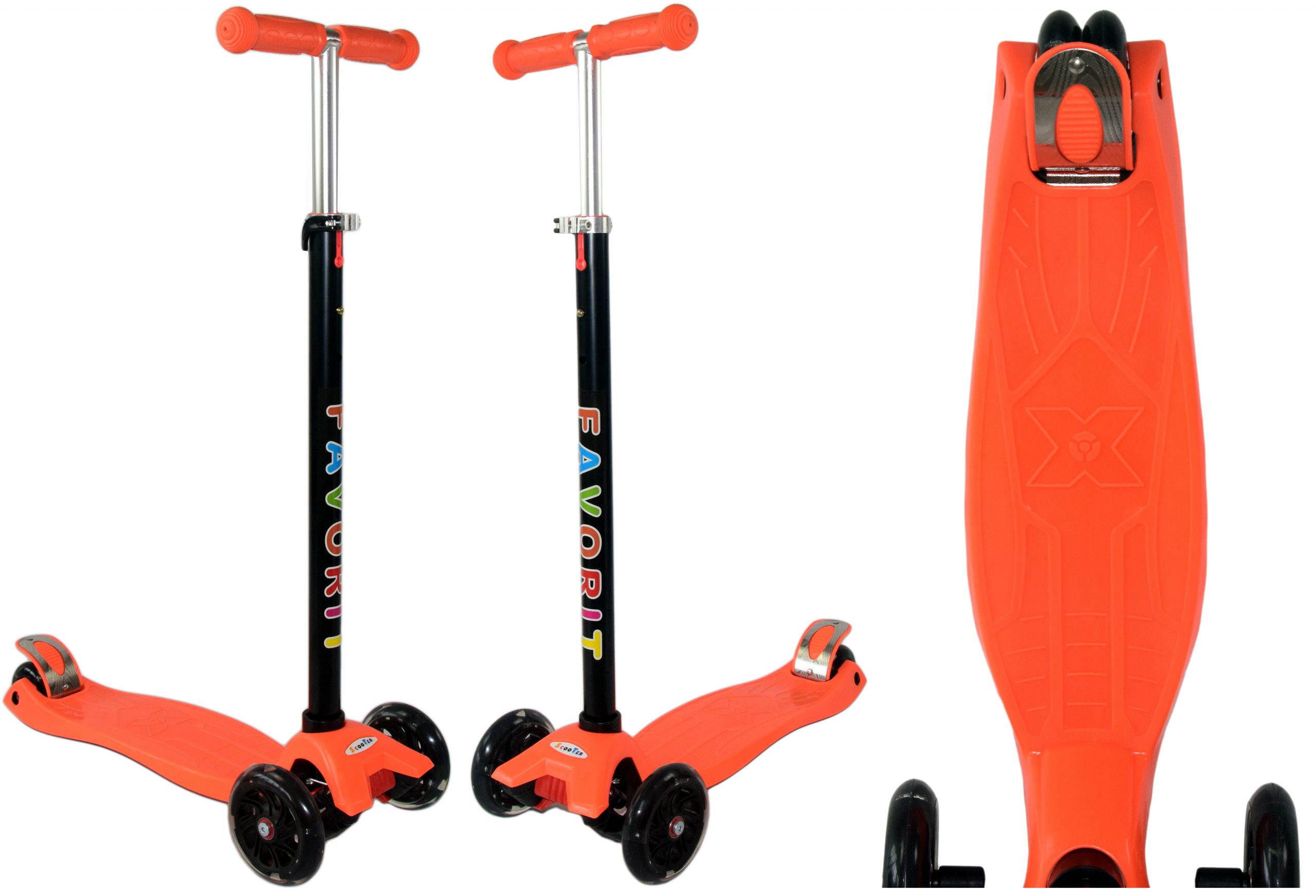 Самокат Favorit Maxi. Регулируемая, алюминиевая ручка. Мягкие PU колеса, при движении светятся. Подшипник АВЕС-7. Задний ножной тормоз, прочная платформа. Максимальная нагрузка 60 кг.