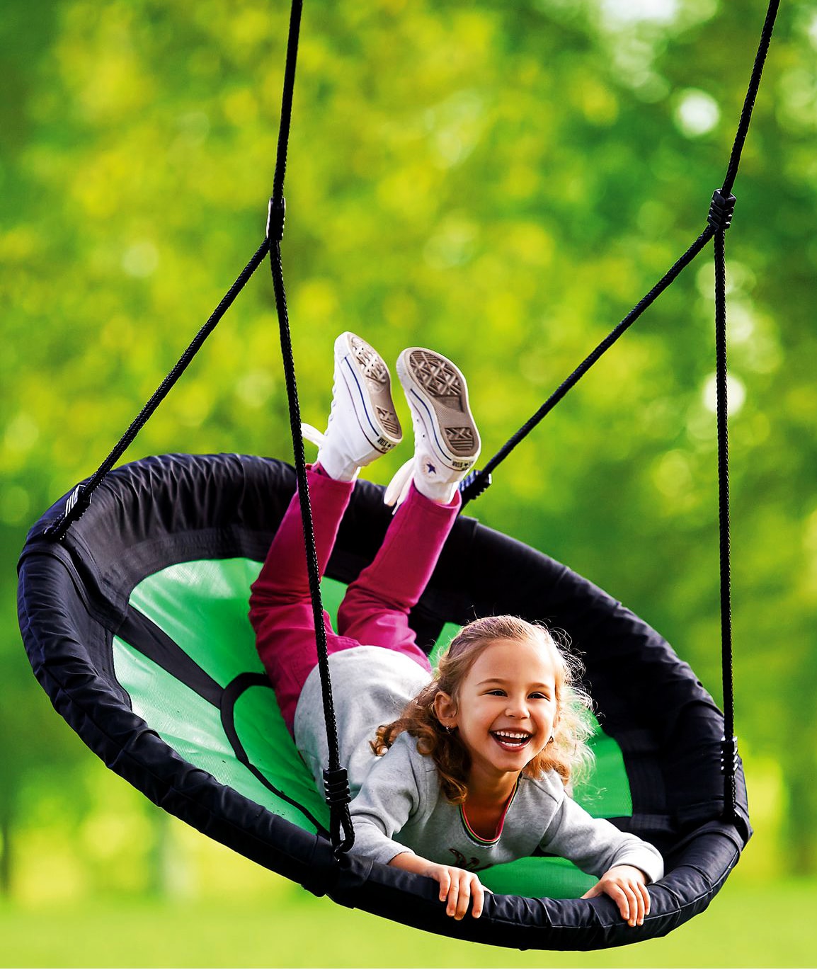 Качели в виде гнезда (качели-гнездо Swibee) станут любимым развлечением для ребенка и вас самих. Размеры гнезда 980×660х60 мм и нагрузка в 150 кг позволяют комфортно разместиться на нем как нескольким детям, так и ребенку со взрослым. Качели являются всесезонными, поэтому не боятся различных погодных условий, а также прекрасно переносят всевозможные условия эксплуатации за счет надежности материала, из которого они изготовлены.