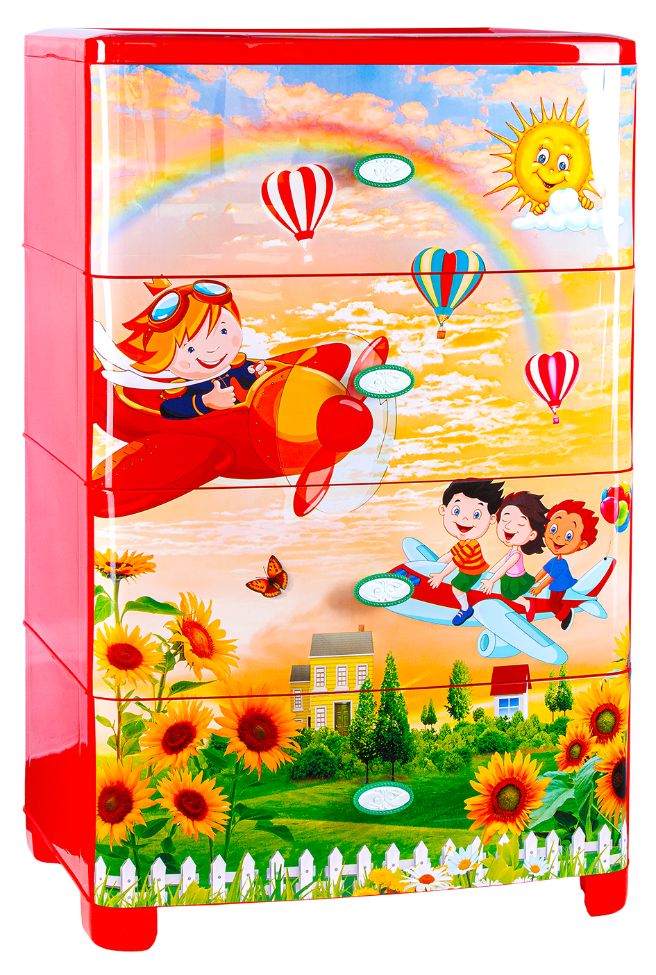 Большой детский комод с красивой яркой аппликацией состоит из четырёх выдвижных ящиков. Благодаря большой глубине и ширине ящиков комод способен вместить большое количество детских вещей. Отлично подходит для хранения белья, полотенец, детских вещей или игрушек.