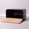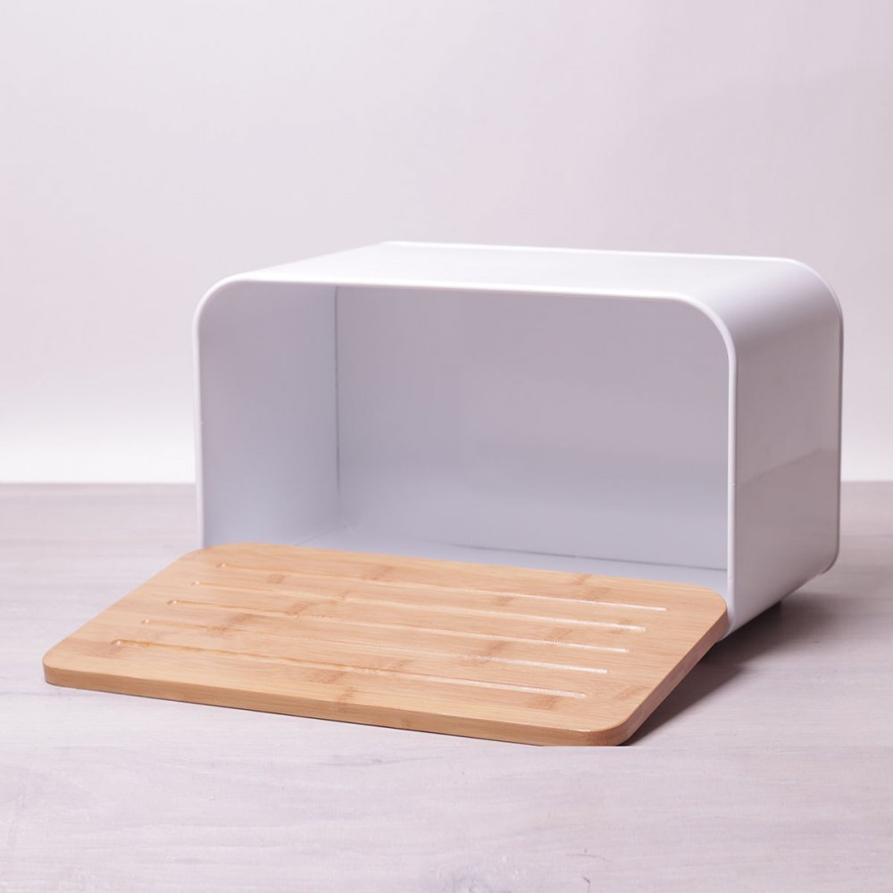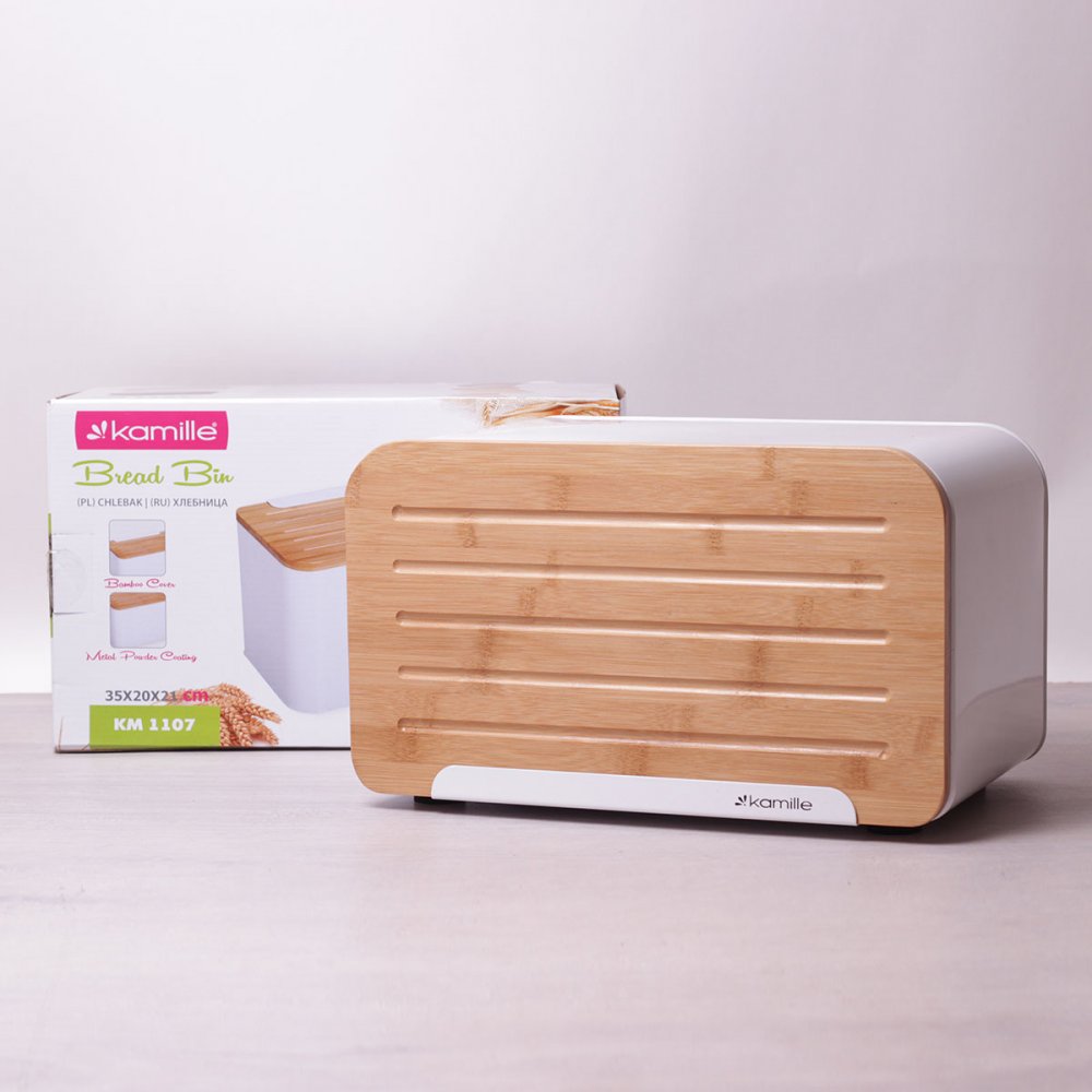 Форма: прямоугольная. Материал хлебницы: нержавеющая сталь. Материал крышки: бамбук. Тип крышки: дощечка (без креплений).