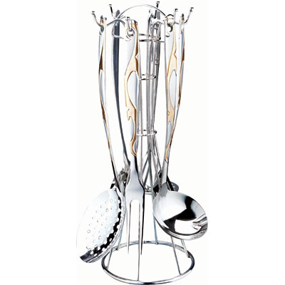 Кулинария — это искусство, которое не терпит беспорядка, хаоса и дискомфорта. Чтобы добиться идеального результата, необходимы и качественные инструменты. Все эти требования успешно воплощены в замечательном комплекте принадлежностей для кухни, которые превратят готовку в настоящий праздник. Используя его, вы легко справитесь с готовкой и сервировкой блюд. Стальные принадлежности совместимы с тефлоновым покрытием сковород, они не повреждают противопригарный слой. Укомплектованная подставка поможет организовать рабочее пространство кухни и избежать беспорядка. Длина кухонной утвари варьируется от 30 (картофелемялка) до 37 (шумовка). Набор принадлежностей изготовлен из высококачественной нержавеющей стали. Этот сплав хорошо взаимодействует с продуктами питания и отличается рядом преимуществ: