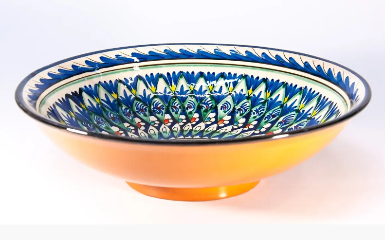 Изделие выполнено из керамики. Узбекская посуда расписывается вручную, у каждого блюда свой уникальный рисунок и расцветка, благодаря чему купив ляган для плова, Вы получаете в свое распоряжение уникальное и самобытное блюдо.